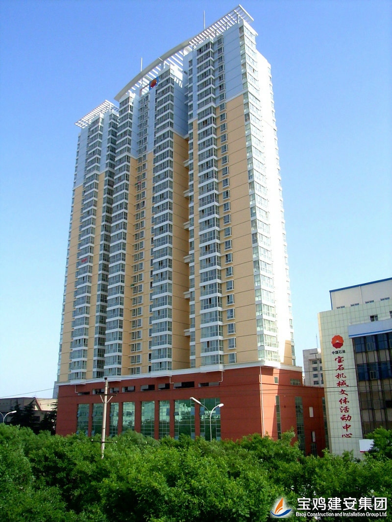 The high-rise residential building of 34# Baoji Petroleum Machinery Factory is located on No.2 Dongfeng Road, Baoji City. It covers an area of ??1770.04㎡ with the building area of 46,037㎡ and belongs to Class I buildings. With two floors underground and thirty-two on the ground, the building has a total length of 64.6m and the total width of 27.4m. The floors below 3F are the podium buildings and the fourth floor is the conversion floor. From fifth floor to the thirtieth-second are two symmetry high-rise residential towers, with each set with two elevators and one scissors emergency staircases. There are a total of 287 households with 10 on each floor, and the total height of the structure is of 99m. The project was awarded the "Chang’an Cup" award of Shaanxi Province.