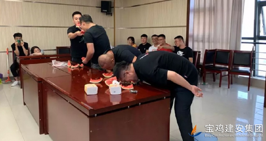 乒乓球比賽后,公司組織了吃西瓜比賽,所有新員工劃分為10支戰(zhàn)隊(duì),伴隨著一陣陣的歡笑,每個(gè)戰(zhàn)隊(duì)都盡情展示自己獨(dú)特的風(fēng)格,最終第8戰(zhàn)隊(duì)獲得比賽的第一名。新員工參與這樣的比賽,彼此間以不同的戰(zhàn)隊(duì)、不同的合作形式,達(dá)到了更快地融入團(tuán)隊(duì)的效果。