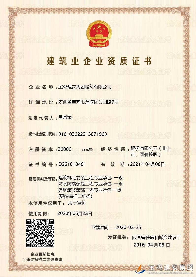 近日,公司資質(zhì)工作再傳捷報(bào),經(jīng)陜西省住房和城鄉(xiāng)建設(shè)廳等主管部門核準(zhǔn),公司申報(bào)的環(huán)保工程專業(yè)承包一級(jí)資質(zhì)、電力工程施工總承包二級(jí)資質(zhì)成功獲批。