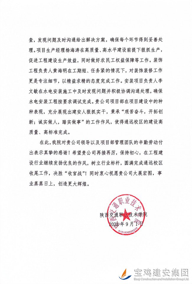 據(jù)悉,陜西交通職業(yè)技術(shù)學院新校區(qū)一期建設項目【EPC】一標段建筑面積為48200.59平方米,工程造價3.4億。合同工期為2021年11月25日至2023年7月7日總工期600天,實際開工日期為2022年5月4日,經(jīng)過一年多的施工,現(xiàn)已完成教學樓和室外工程全部施工內(nèi)容,并于2023年9月1日正式投入使用。