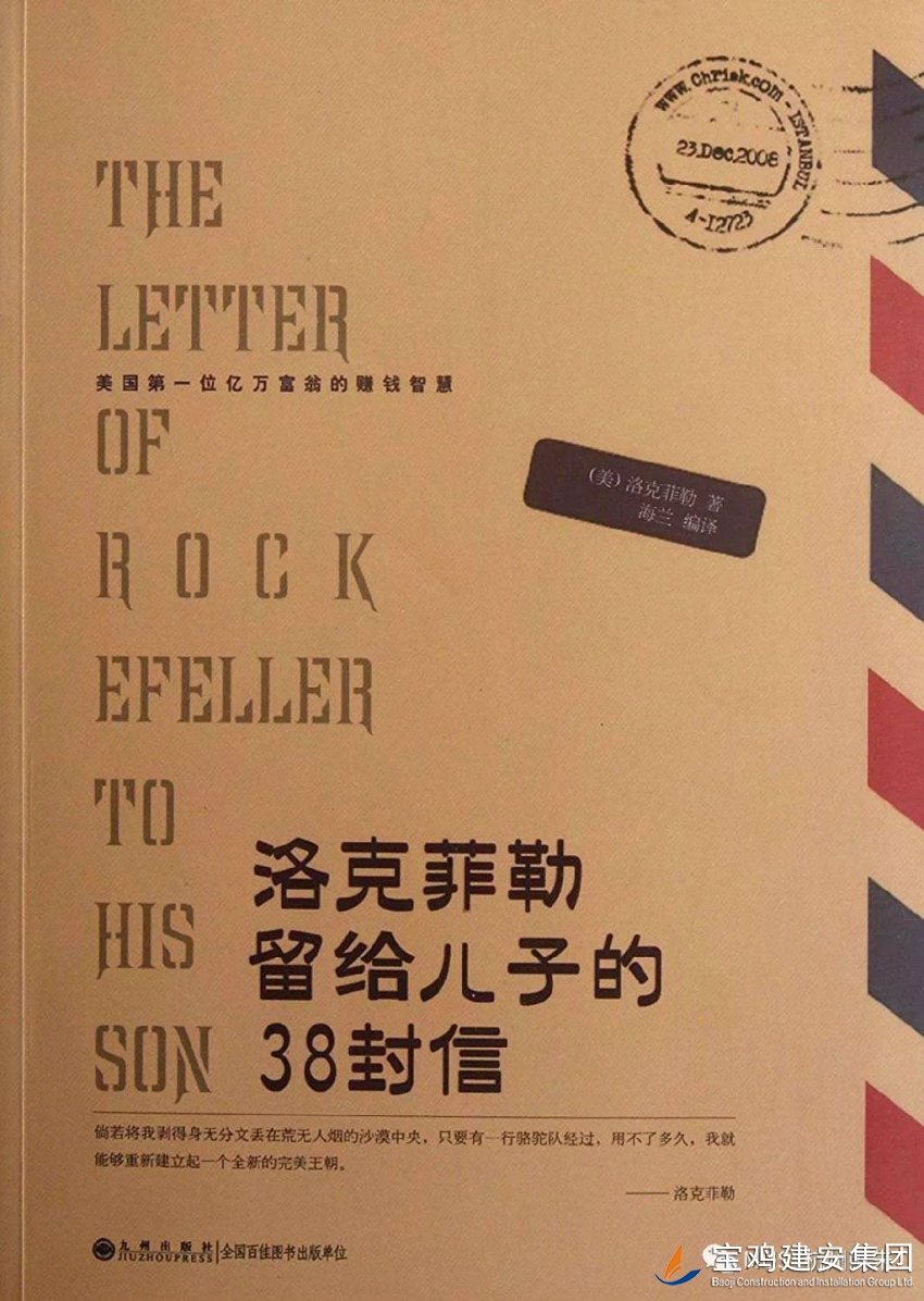 單位:第八項(xiàng)目部 作者:張兆陽 中國有句古話:至樂莫若讀書,至要莫若教子。如何教育引導(dǎo)好年輕人,長久以來都是世界各個(gè)階級父母所關(guān)注的話題。洛克菲勒,標(biāo)準(zhǔn)石油公司創(chuàng)立者、全球首富。2009年福布斯公布“美國史上十五大富豪”,洛克菲勒名列榜首。這樣一個(gè)商業(yè)巨擘,同樣也在研究如何指引年輕一代。在這本書中,就淋漓盡致地呈現(xiàn)出了他對教育的見解。