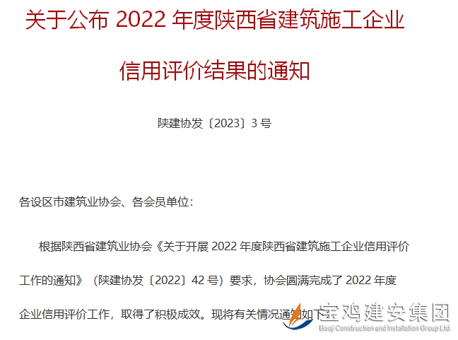 據(jù)悉,2022年度,參評(píng)企業(yè)范圍涵蓋了全省9個(gè)地市,涉及房建、市政、交通、鐵路等多個(gè)行業(yè)(專業(yè)),分布更加均衡,尤其是今年申報(bào)信用評(píng)價(jià)的企業(yè)數(shù)量創(chuàng)歷年來(lái)新高,企業(yè)參與度更加積極,競(jìng)爭(zhēng)更加強(qiáng)烈。寶雞建安集團(tuán)股份有限公司再次獲得殊榮,首先來(lái)自于集團(tuán)領(lǐng)導(dǎo)的高度重視和指導(dǎo),其次與各部室通力協(xié)作密不可分,大家齊心協(xié)力,同心同德,不計(jì)得失,甘于奉獻(xiàn),充分展示了并肩協(xié)作的工作作風(fēng)。陜西省建筑施工企業(yè)信用AAA級(jí)榮譽(yù)的獲得,必將進(jìn)一步激發(fā)廣大員工追求卓越、勇攀高峰的拼搏精神,不斷為企業(yè)更快更好發(fā)展奉獻(xiàn)自身的智慧和力量!