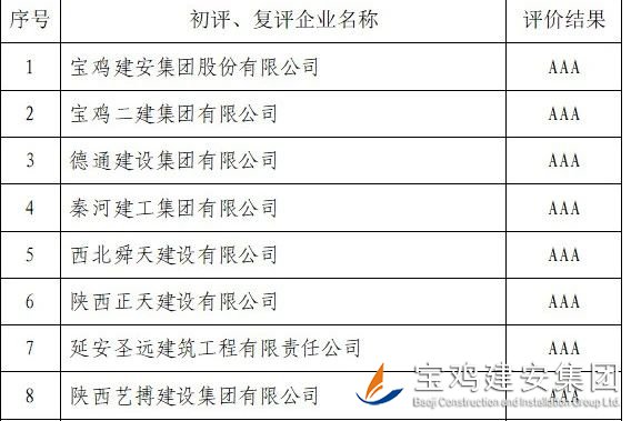 按照統(tǒng)一安排部署,省建協(xié)于2022年11月19日組織評(píng)審專家一行蒞臨建安集團(tuán),現(xiàn)場(chǎng)面對(duì)面審驗(yàn)資料,并深入明星村棚戶區(qū)改造三期地塊一項(xiàng)目1#-2#商住樓及地下車庫(kù)項(xiàng)目進(jìn)行實(shí)地訪談,隨后協(xié)會(huì)又于2023年1月11日正式發(fā)文進(jìn)行為期7天的公示,最終,我公司順利通過(guò)復(fù)審,再次躋身陜西省建筑施工企業(yè)信用評(píng)級(jí)AAA級(jí)企業(yè)行列。